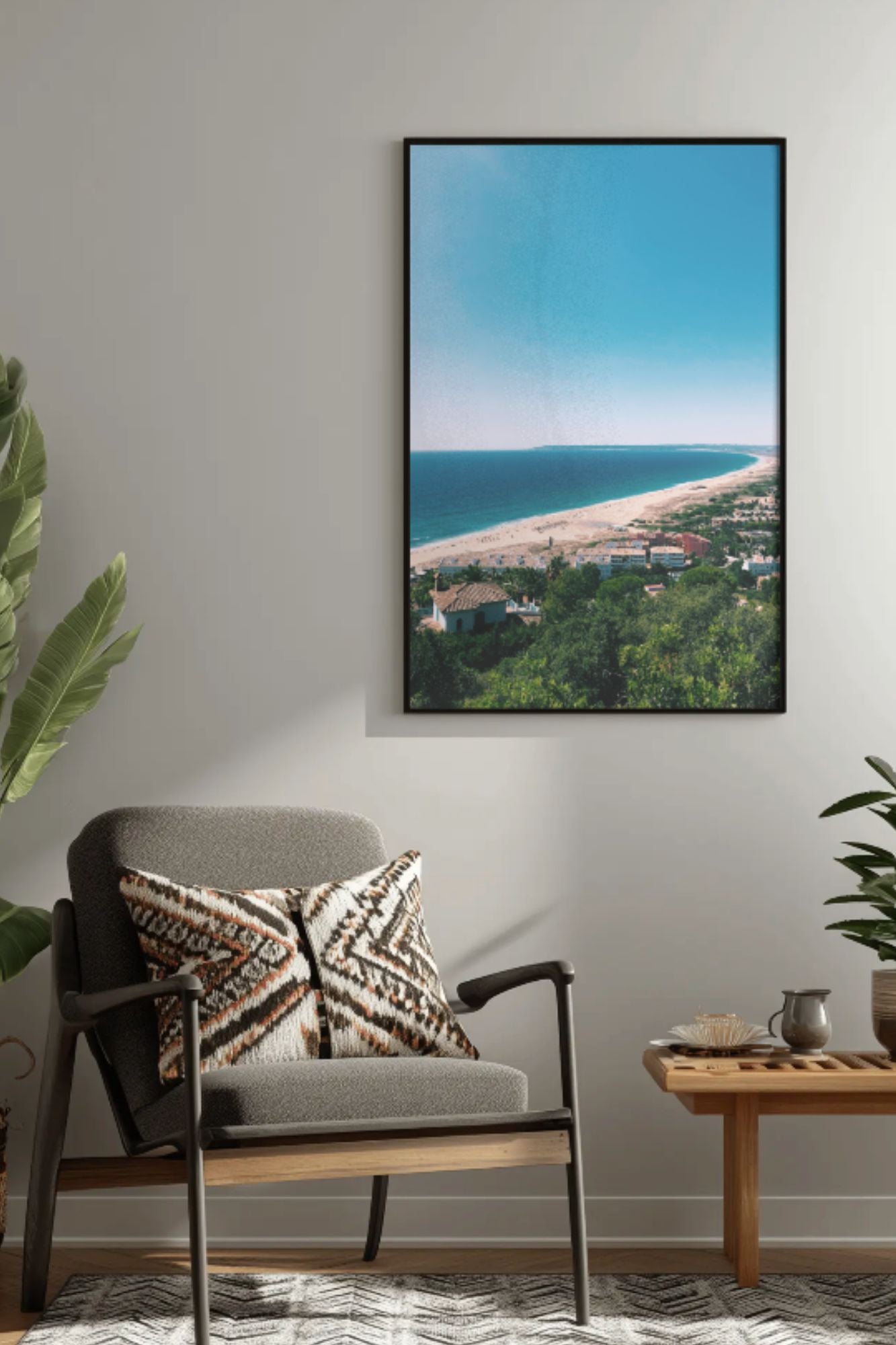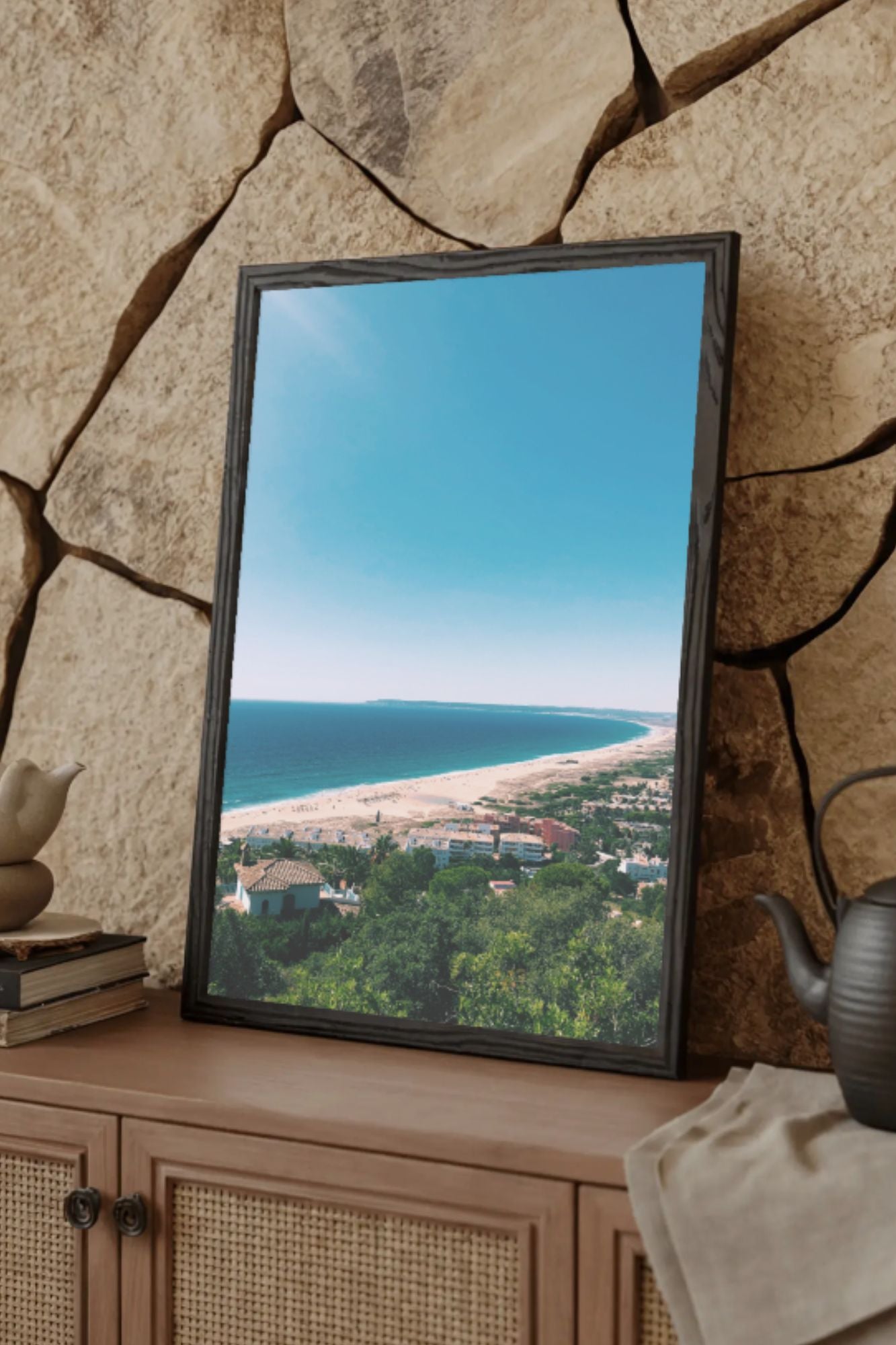 La luz de Cádiz, el azul infinito y la calma de Zahara de los Atunes. Esta lámina captura ese instante desde lo alto, donde la costa se estira sin prisa y todo se siente más ligero.